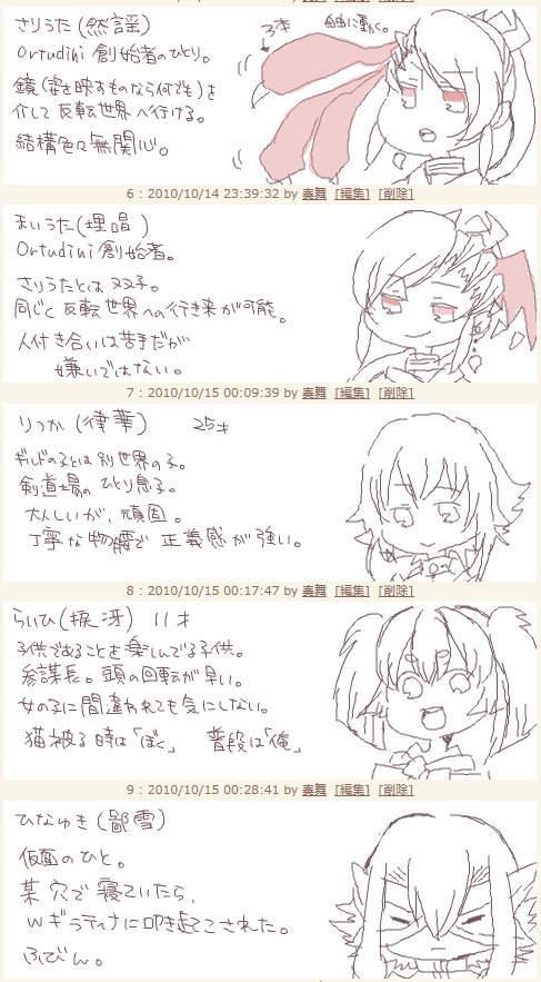 絡音 (からのね) 蕾良(らいら) 結(むすび) 苹(うきくさ) 飴包(ゐつつ) 梠咲(のきさき) 扇(おうぎ) 括瑠(くくる) |